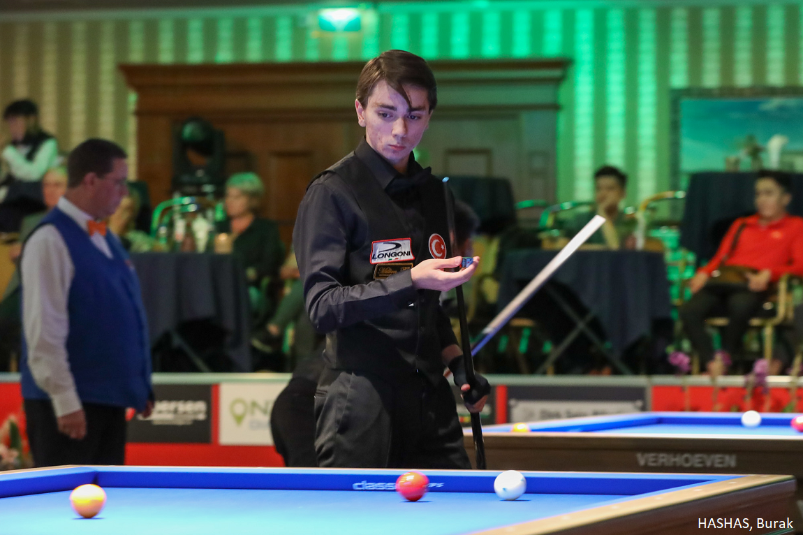 The billiard world already knew he was a great talent. Now it is evident that he is a champion as well: 16-year-old Burak Hashas from Turkey is the new UMB 3-cushion Junior World Champion. In a spectacular but one-sided final, he beat Greece’s Dimitrios Seleventas to win the 2022 title: 35-10 in 19/18 innings.