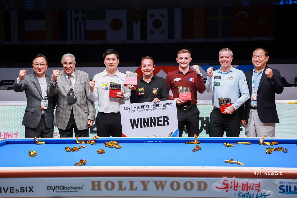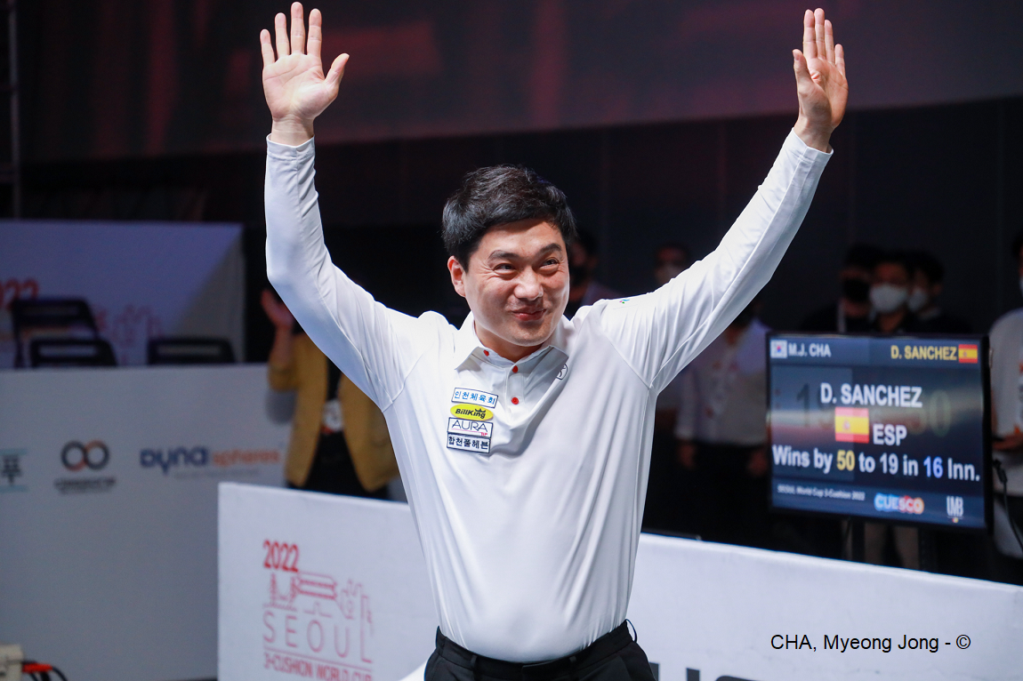 The 2022 UMB Seoul World Cup will mostly be remembered for the two majestic semifinals on Sunday. The final was, unfortunately for the talented Korean Myeong Jong Cha, a one-sided affair with Sánchez in control from start to finish: 50-19 in 16 innings. The Spaniard is turning into the main “angstgegner” for world champion Dick Jaspers, who has now lost five in a row to Sánchez. The Dutchman however, remains solidly in first place on the world ranking.