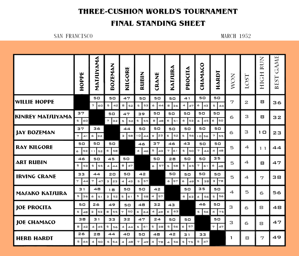 After marrying a U.S. Army non-commissioned officer in 1950, Katsura immigrated with him to the United States in 1951. There she was invited to play in the 1952 U.S.-sponsored World Three-Cushion Championship, ultimately taking seventh place at that competition. Katsura was the first woman ever to be included in any world billiards tournament. Her fame cemented, Katsura went on an exhibition tour of the United States with eight-time world champion Welker Cochran, and later with 51-time world champion Willie Hoppe. In 1953 and 1954, she again competed for the world three-cushion crown, taking fifth and fourth places respectively.