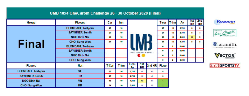 14:00 CET - FINAL ROUND I BLOMDAHL Torbjorn VS SAYGINER Semih VS NGO Dinh Nai VS CHOI Sung-Won