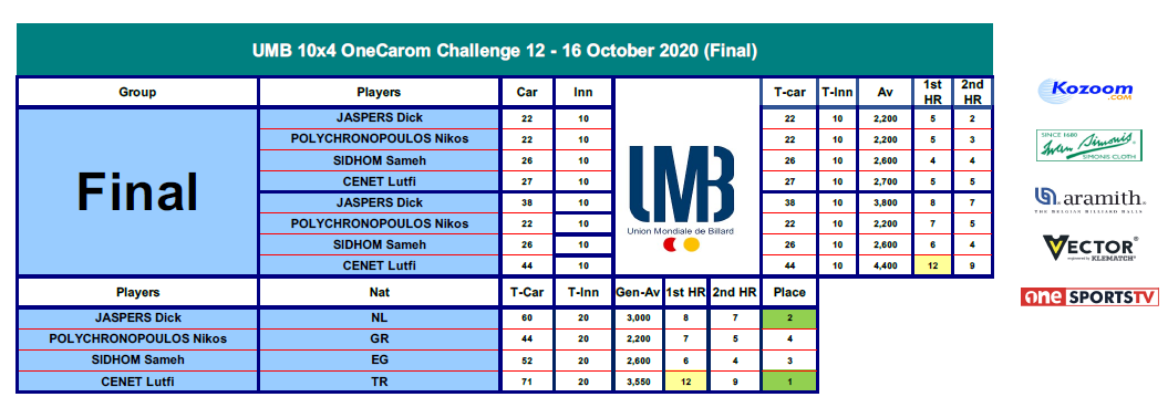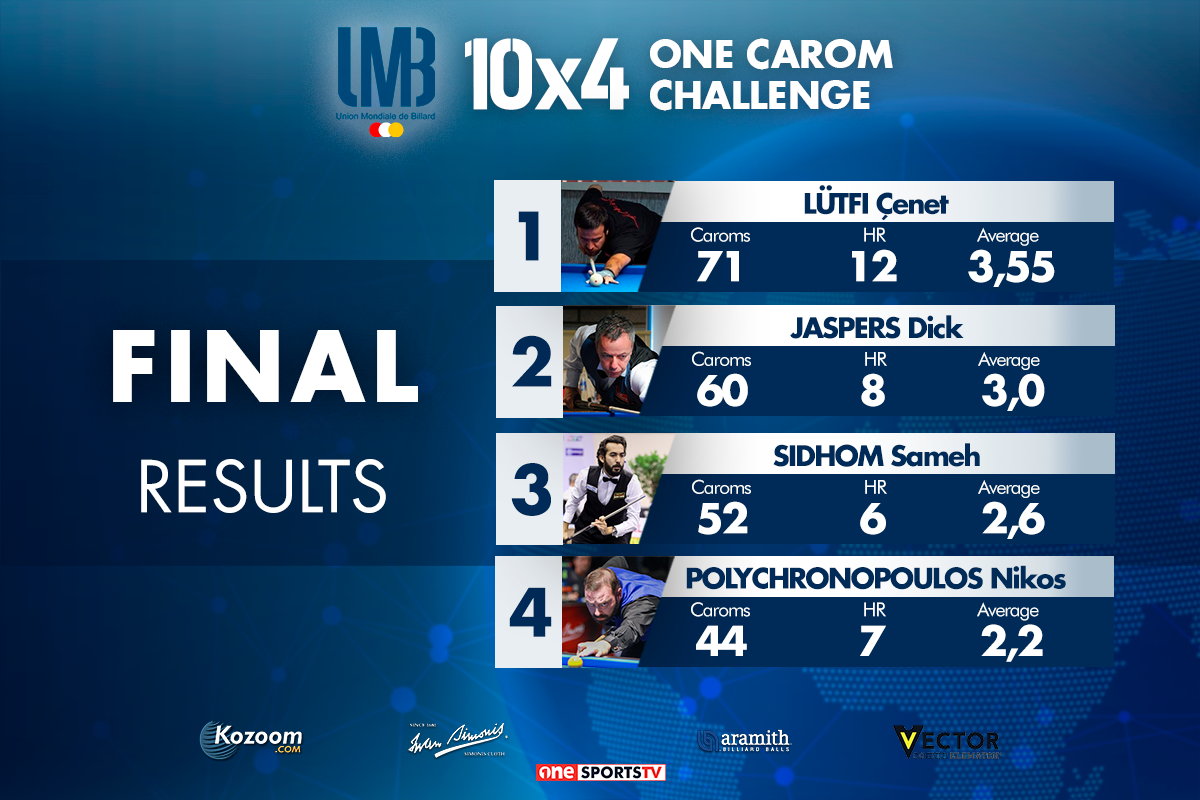 A new attractive playing virtual format in two groups of 4 Players with series of 10 innings from the break-shot - 30 innings for de qualification rounds and 20 innings for the final rounds.