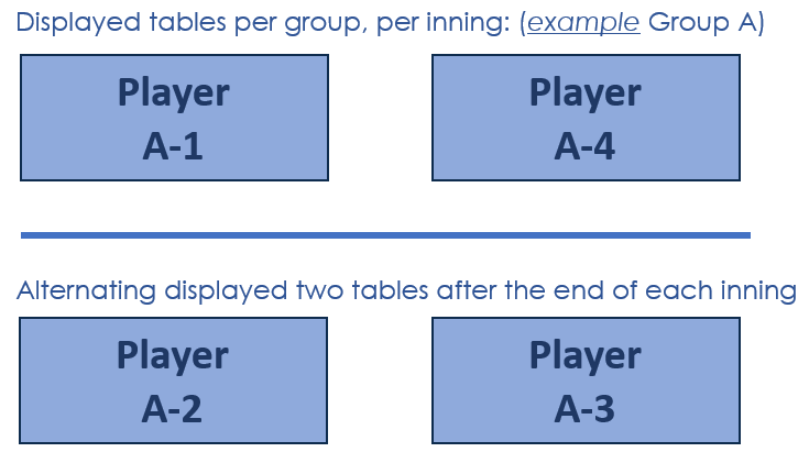 After 30 innings (over 3 days) the two players of each group with the best accumulated score will pass to the final round. The other two players are eliminated.