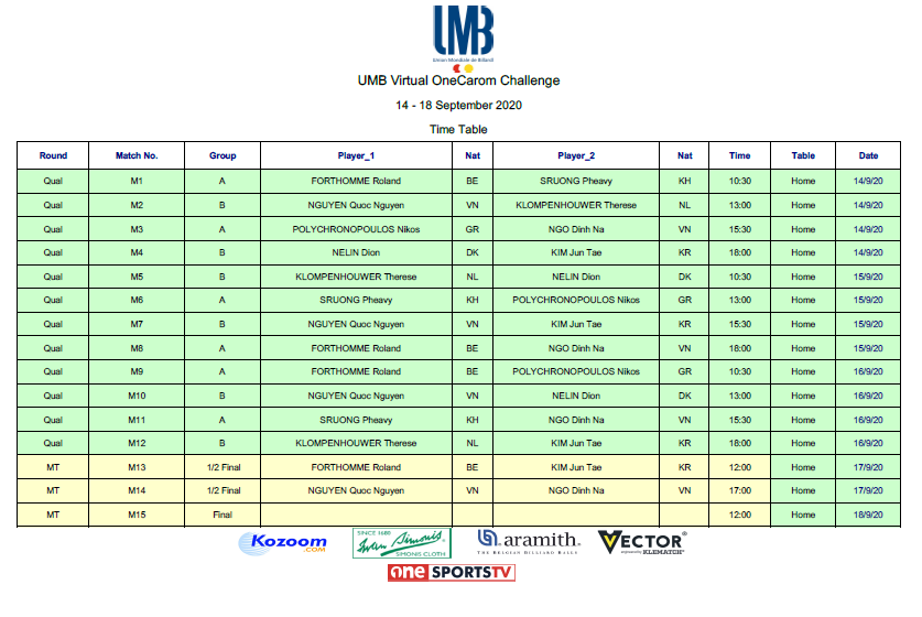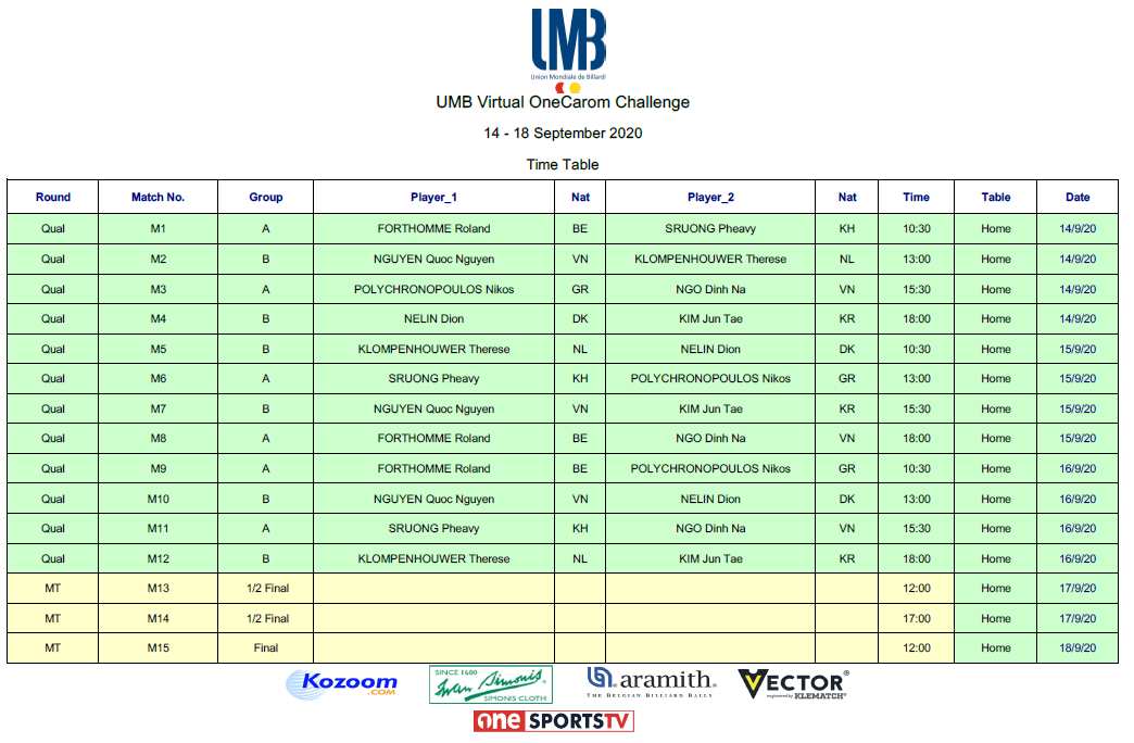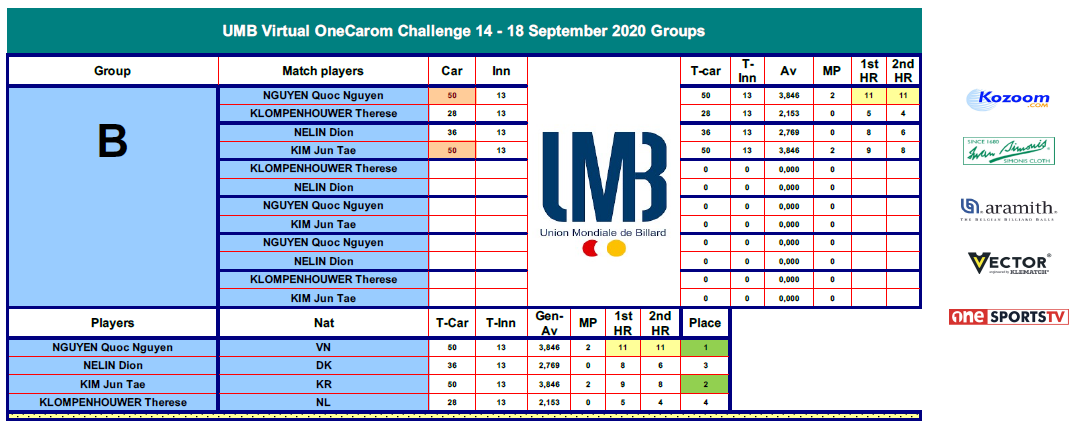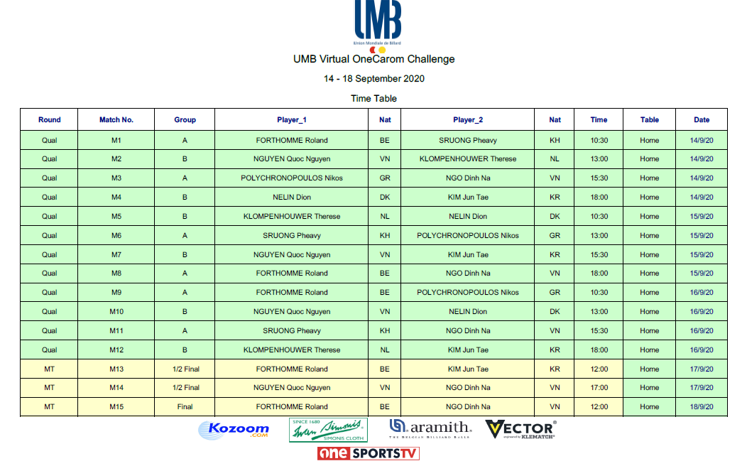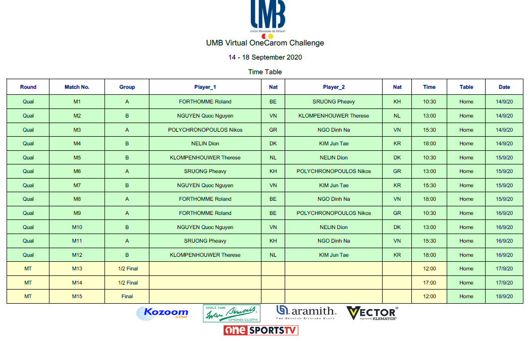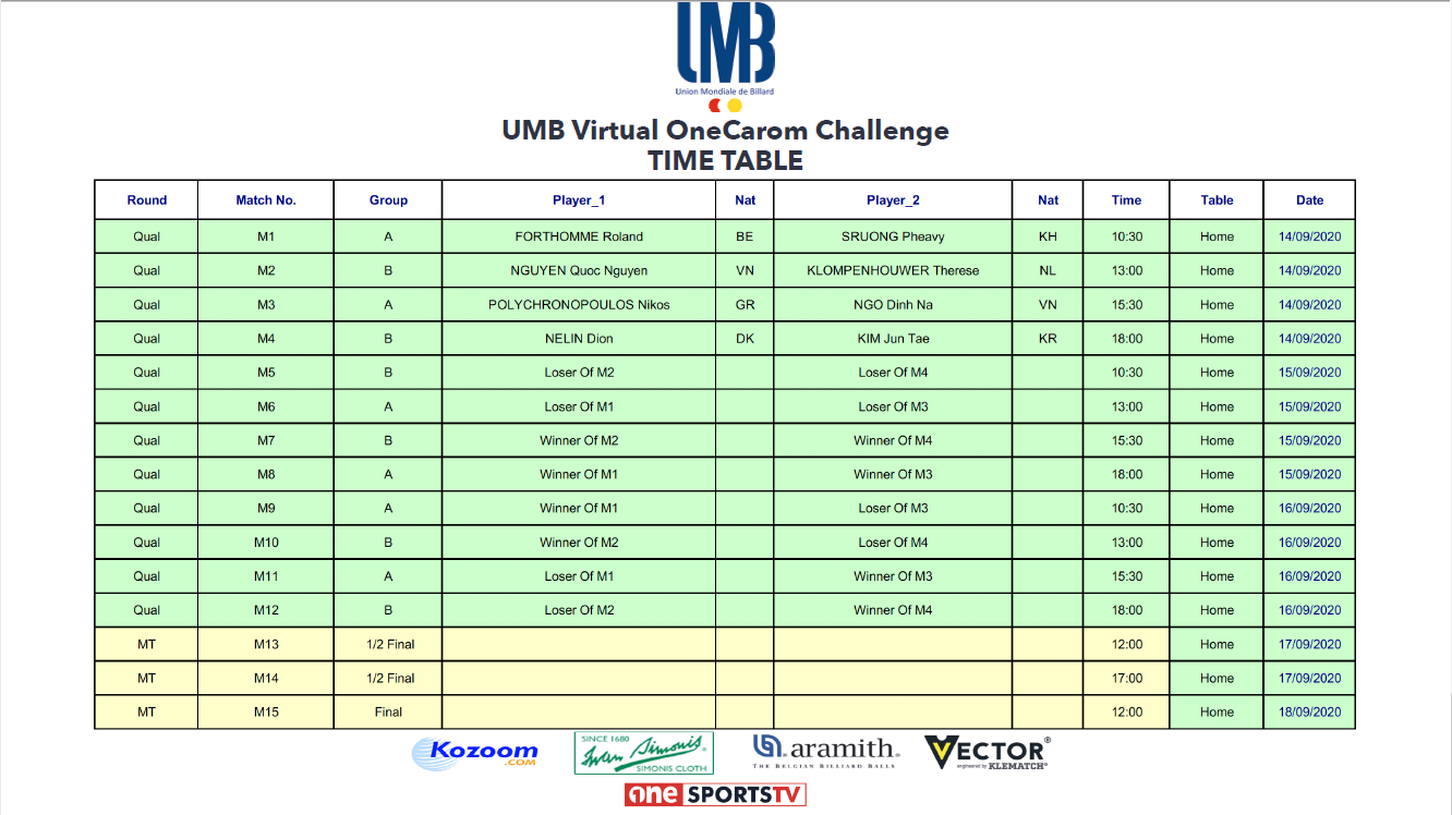 The 8 new invited top Players, Roland FORTHOMME , Pheavy SRUONG, Nguyen Quoc NGUYEN, Therese KLOMPENHOUWER, Nikos POLYCHRONOPOULOS, Ngo Dinh NA, Dion NELIN and Jun Tae KIM, will compete for the Challenge title, in two groups of four Players.