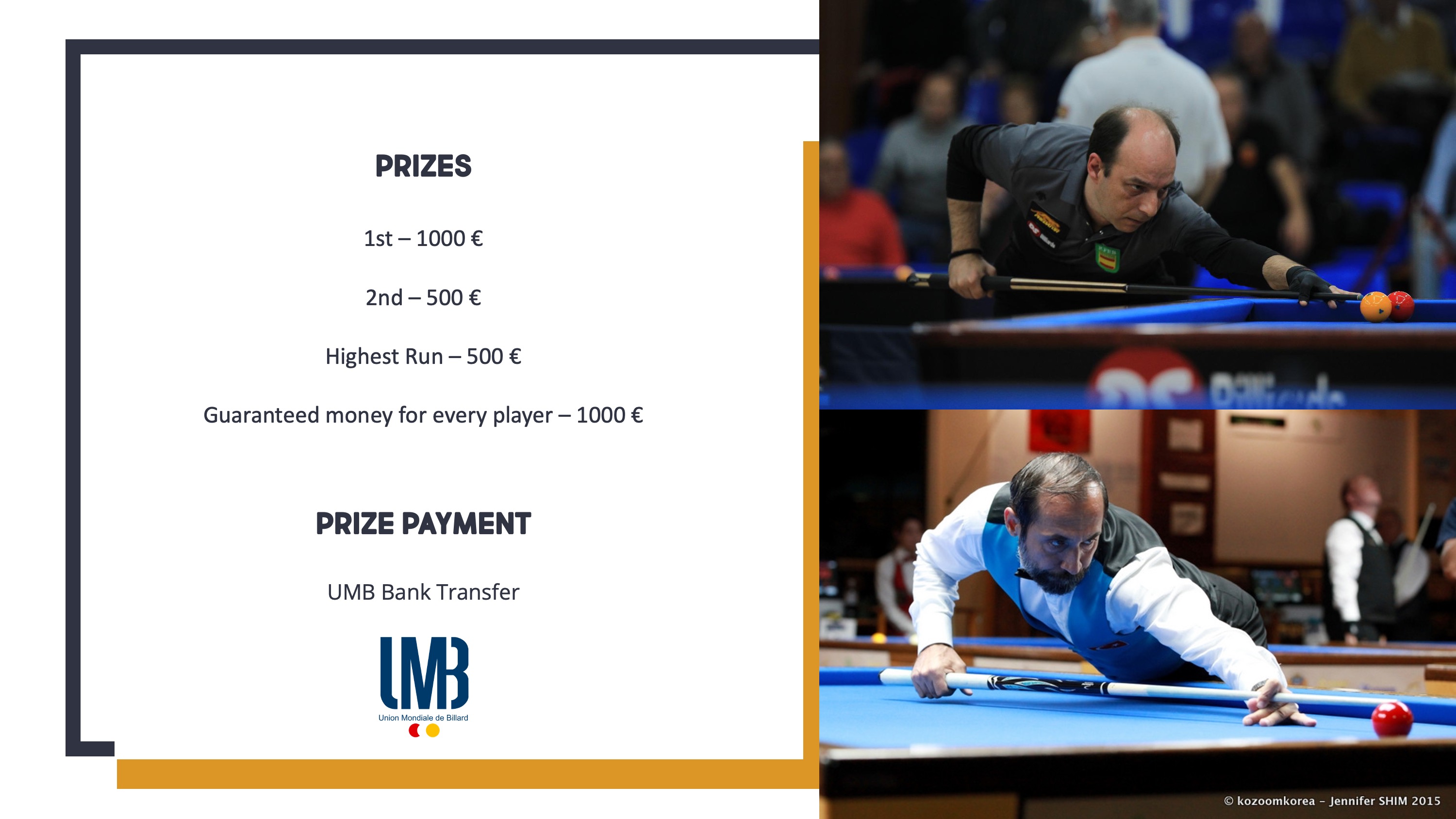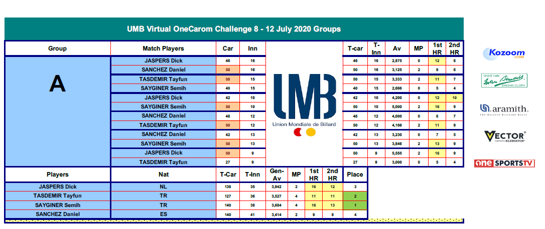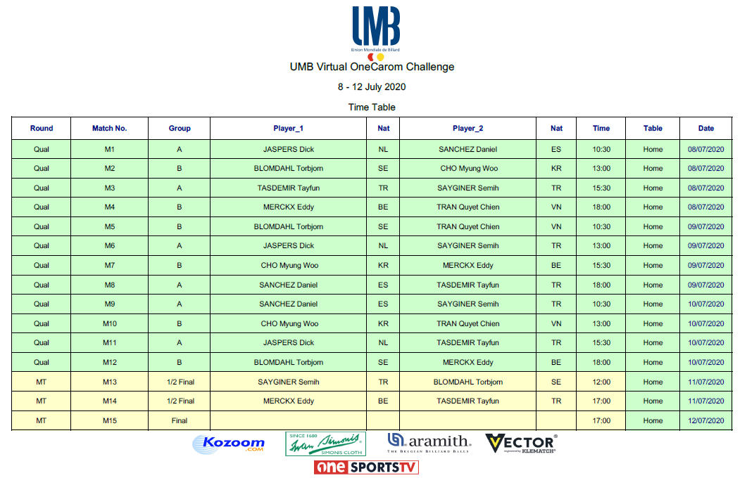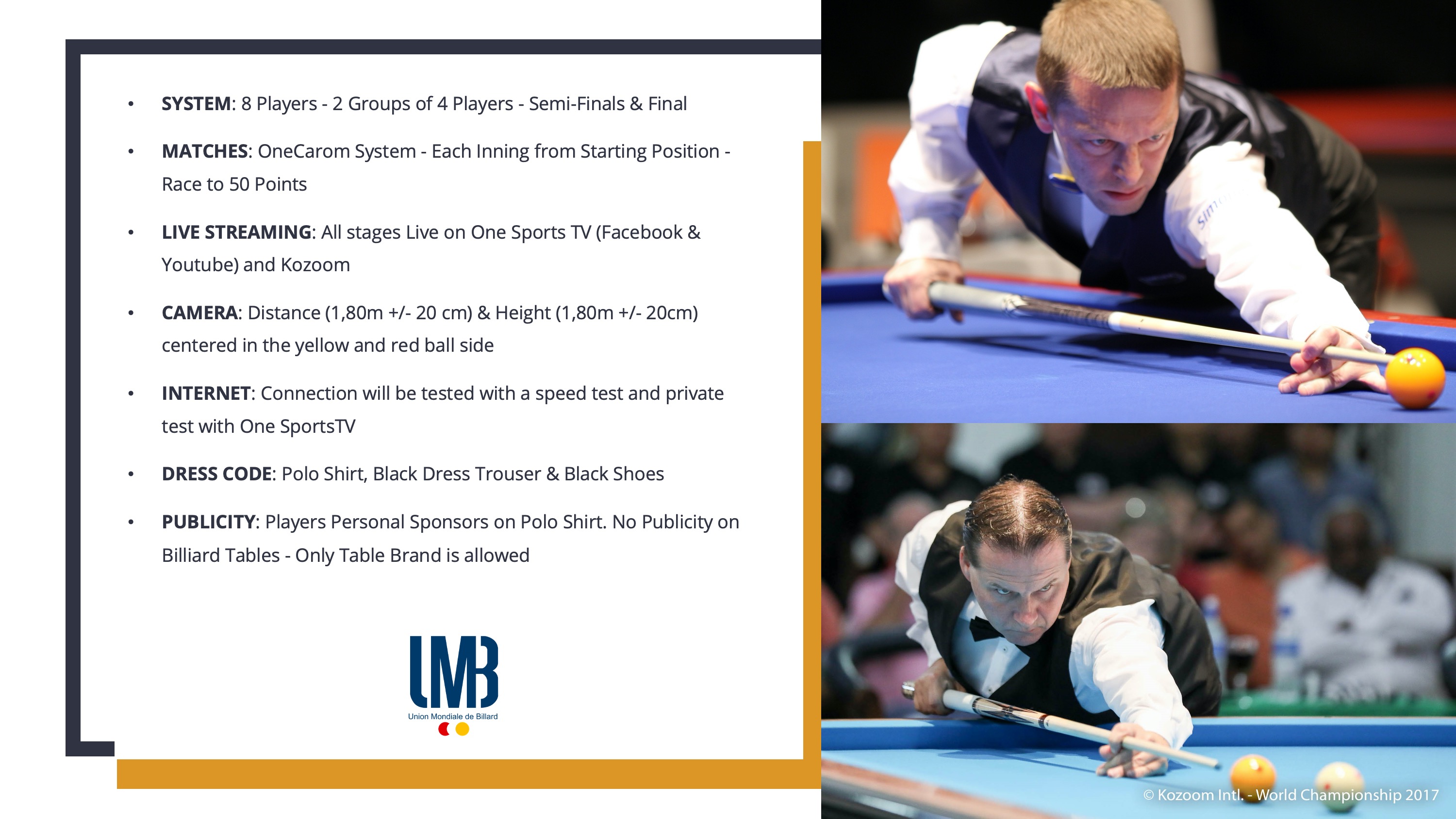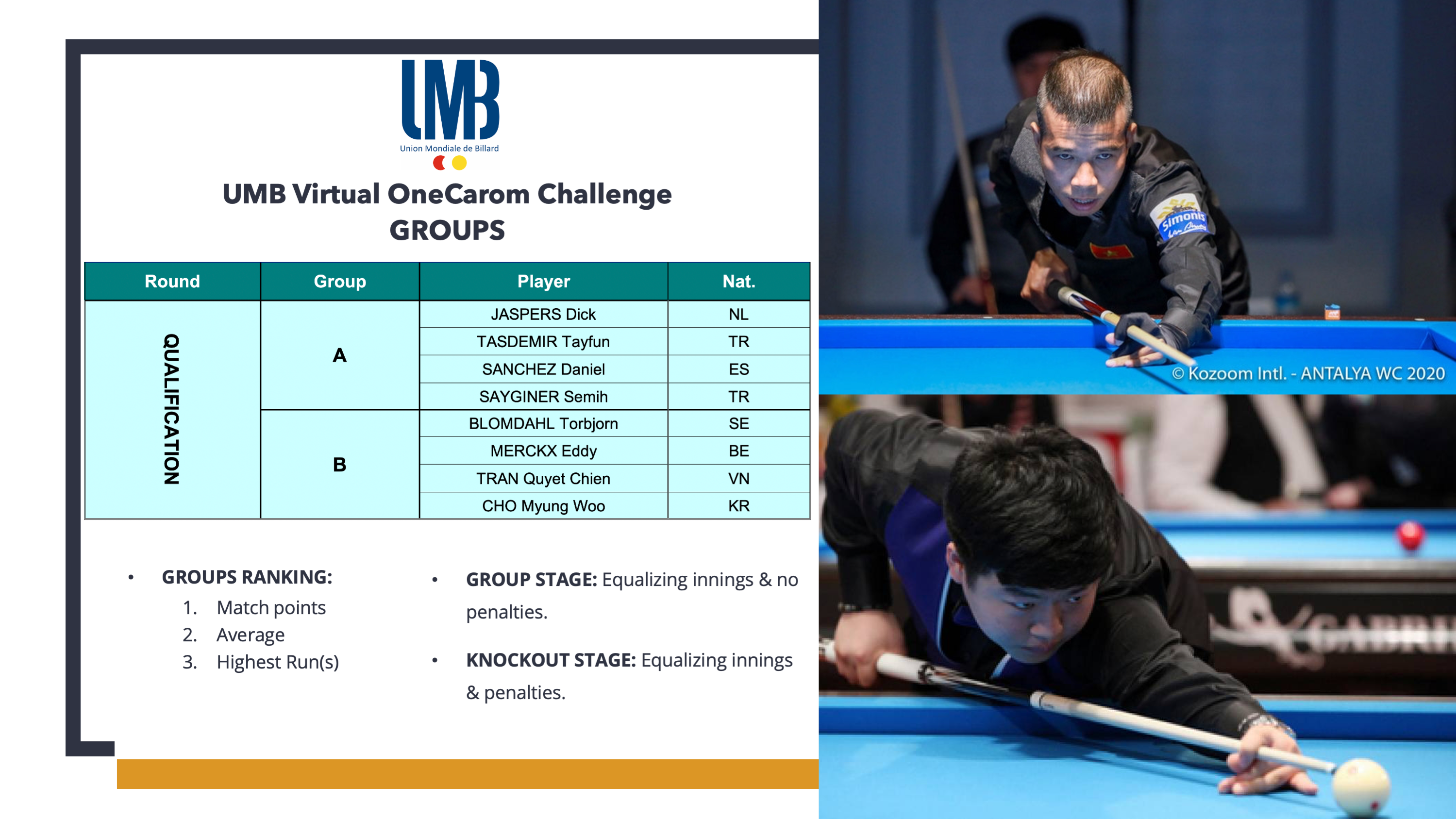 A few weeks ago, Dani Sánchez and Semih Sayginer played a try-out in this virtual format, as suggested by Spanish broadcaster One Sports TV. Two players use their home or club table and play a “virtual” match to 50 points, every inning starting with the break shot. It proved an attractive formula, and the UMB picked it up in an eight-player set up with a €1.000 player guarantee and symbolic first prize of € 1.000, second prize of € 500 and € 500 for the high run.