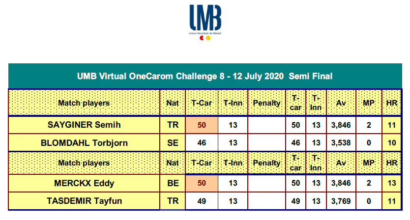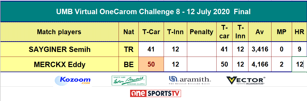 One of the hardest things to do in 3-cushion is to beat Eddy Merckx in a final. Semih Sayginer can tell you all about it. The Belgian and the Turk played the final of the first UMB Virtual One Carom Challenge, and it was the Belgian who made a decisive run of twelve to claim the final win: 50 – 41 in 12.
