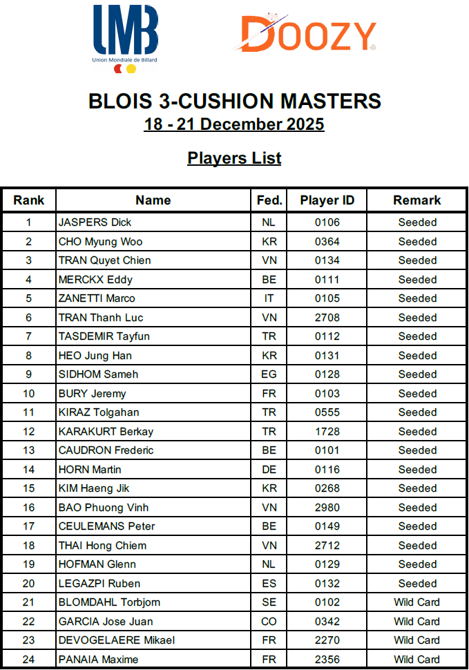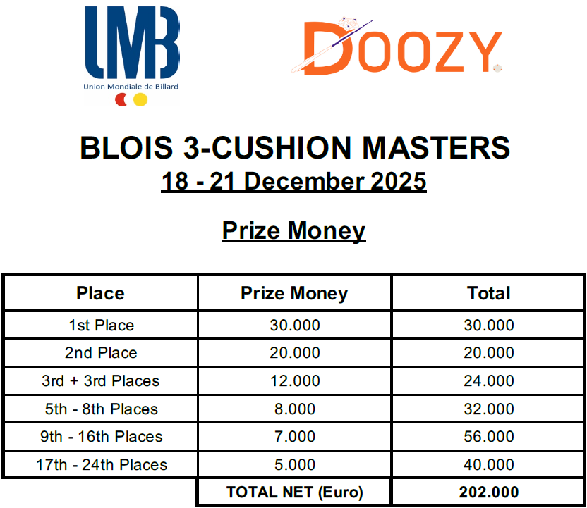 DOOZY Billiards' initiative to organize the tournament in December in Blois, France, was very well received, and we can now announce the BLOIS 3-CUSHION MASTERS event, with the participation of 24 elite players.
