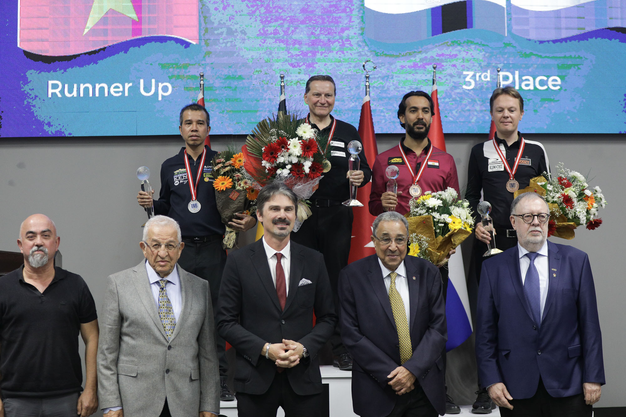 The level of play in Ankara had been splendid all week, but on the final Sunday all four players struggled with a table that had lost a bit of its suppleness, and the lines were getting shorter. Both Hofman (against Merckx) and Sidhom (against Tran) could not really get their scoring going. Sidhom even trailed 19-1 after 9 innings, and his later runs were not high enough to repair the damage. Merckx and Tran, in their respective semi’s, were not on the peak of their form either, but they kept their unforced errors to a minimum. In the end, Tran beat Sidhom 50-22 in 19/18, and Merckx beat Hofman 50-35 in 28.