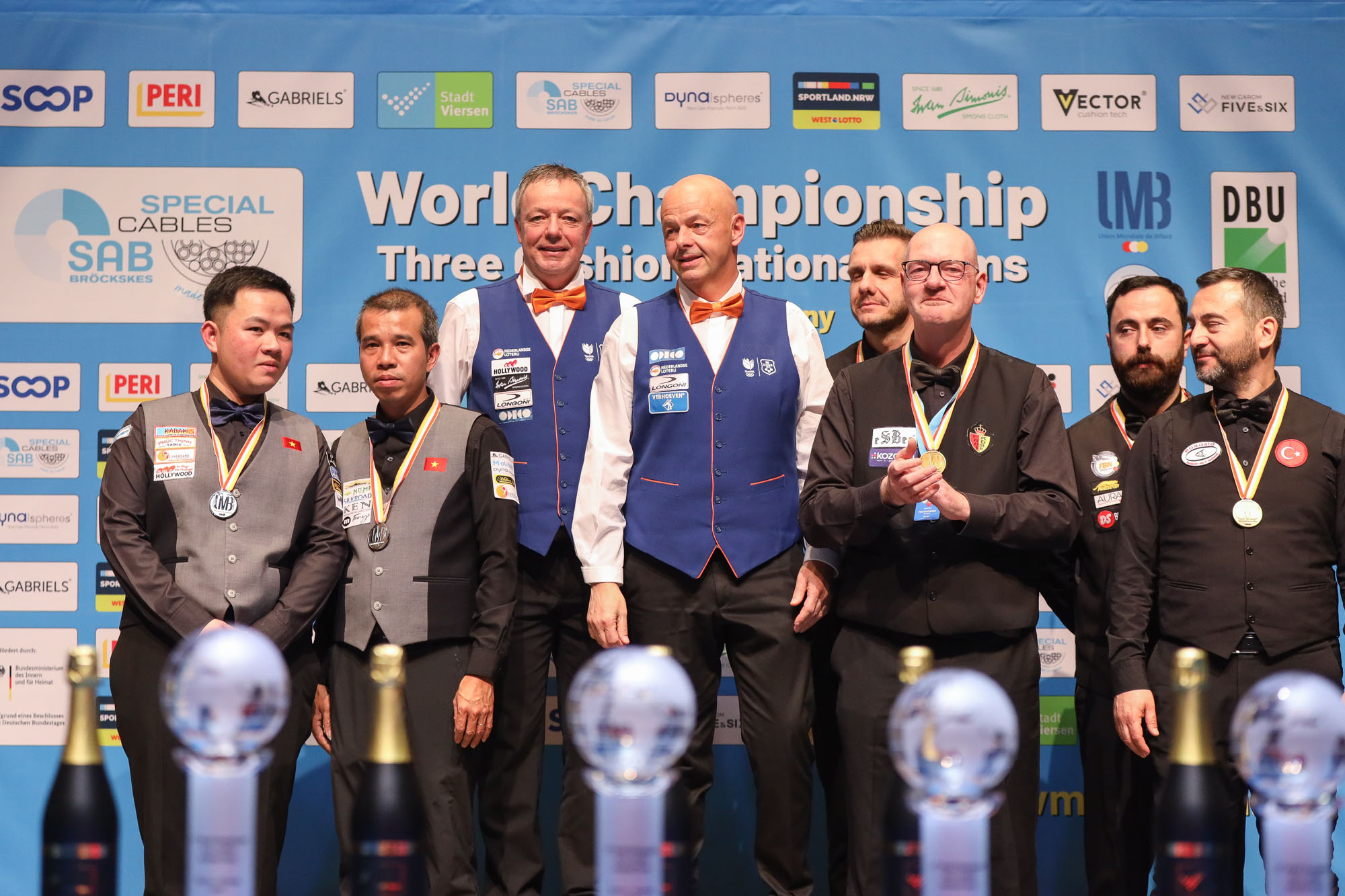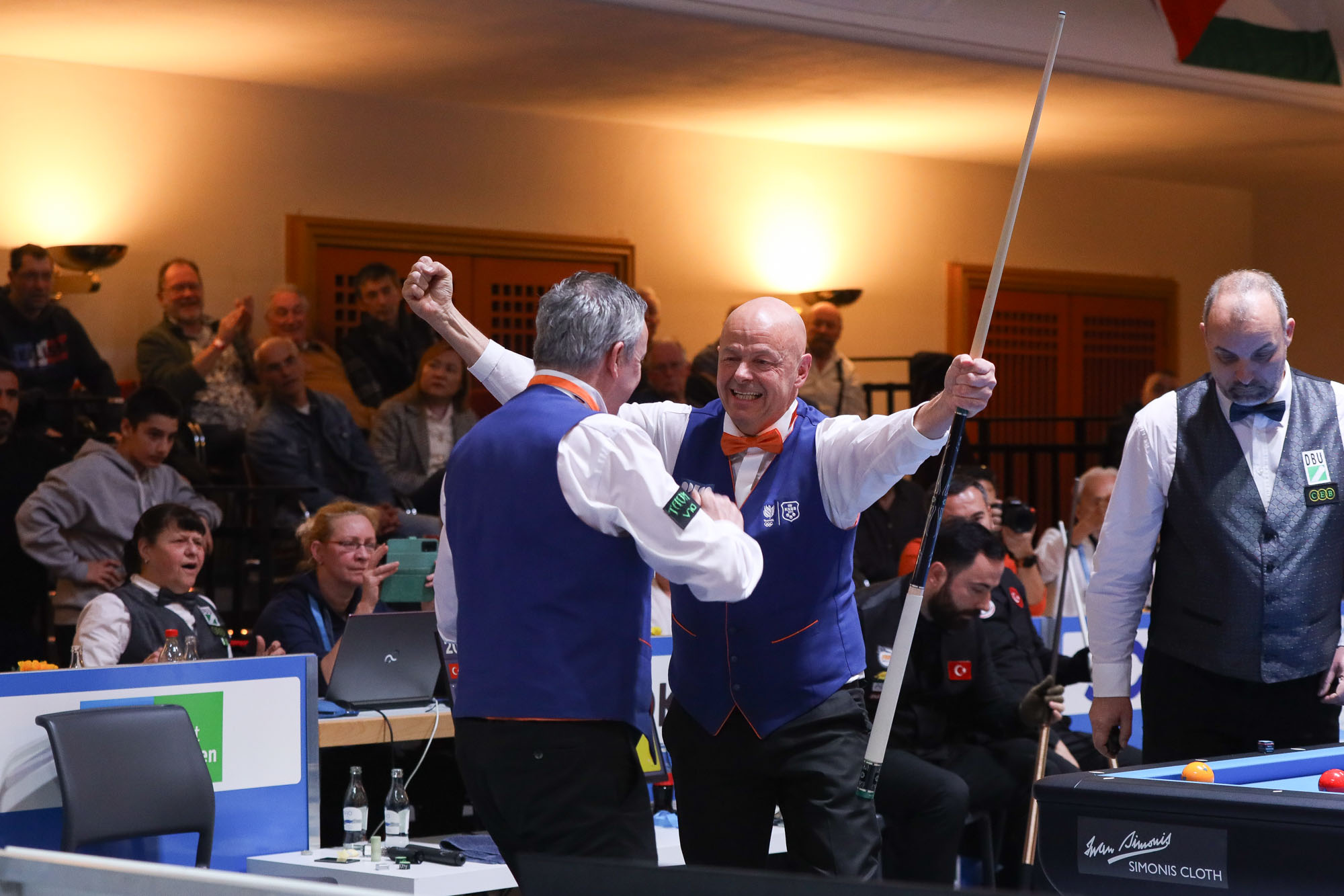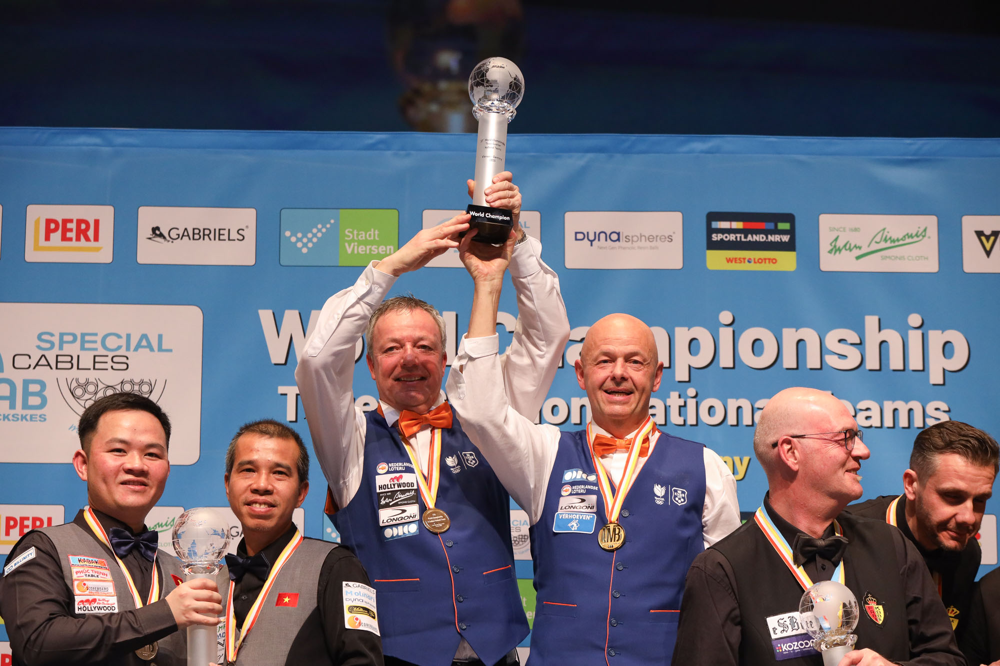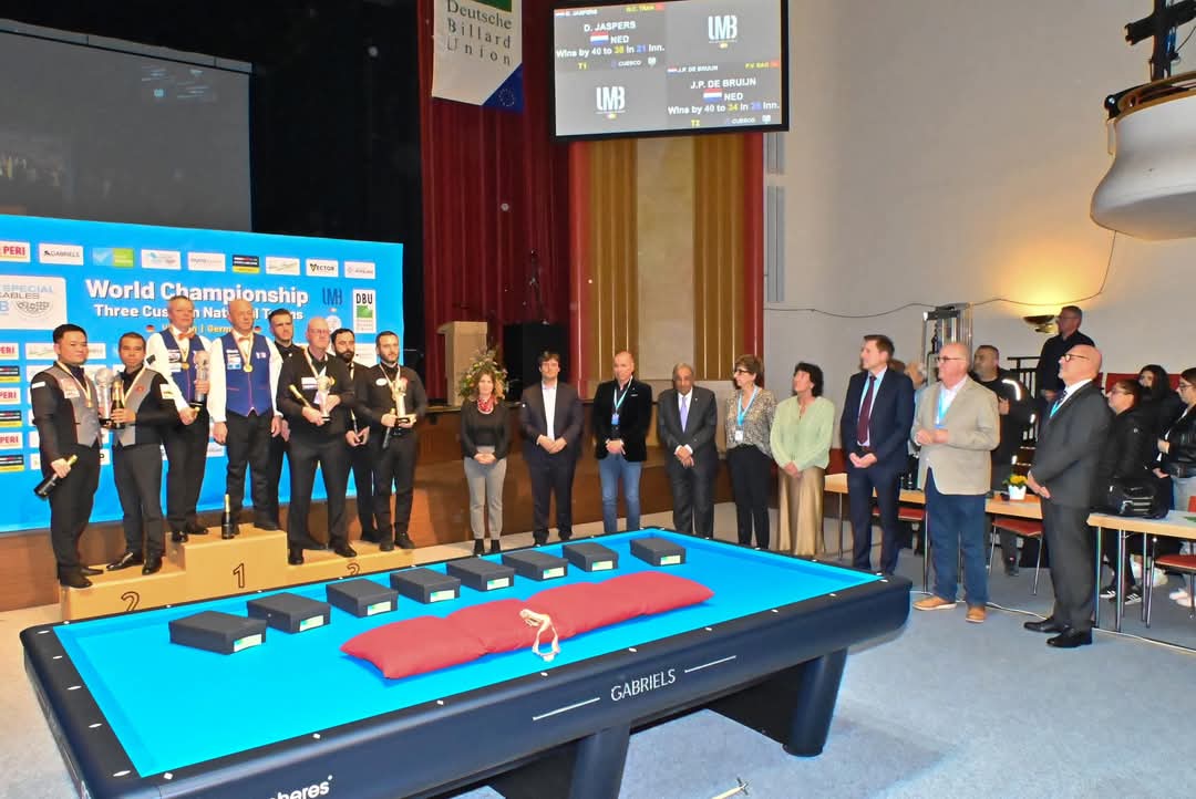No Scotch Double was needed to decide the final, two regular matches were sufficient. But the closing match of the World Championship for National Teams in Viersen did not lack in excitement. Jaspers won a close contest with Quyet Chien Tran (40-38 in 21) and Jean Paul de Bruijn stayed ahead of Phuong Vinh Bao (40-34 in 28). That means the title holder of 2024 will have to wait for a repeat. For the Netherlands, this is their fourth world crown, after 1998 (Jaspers / Burgman), 1999 (Jaspers / Burgman) and 2015 (Jaspers / van Erp).
