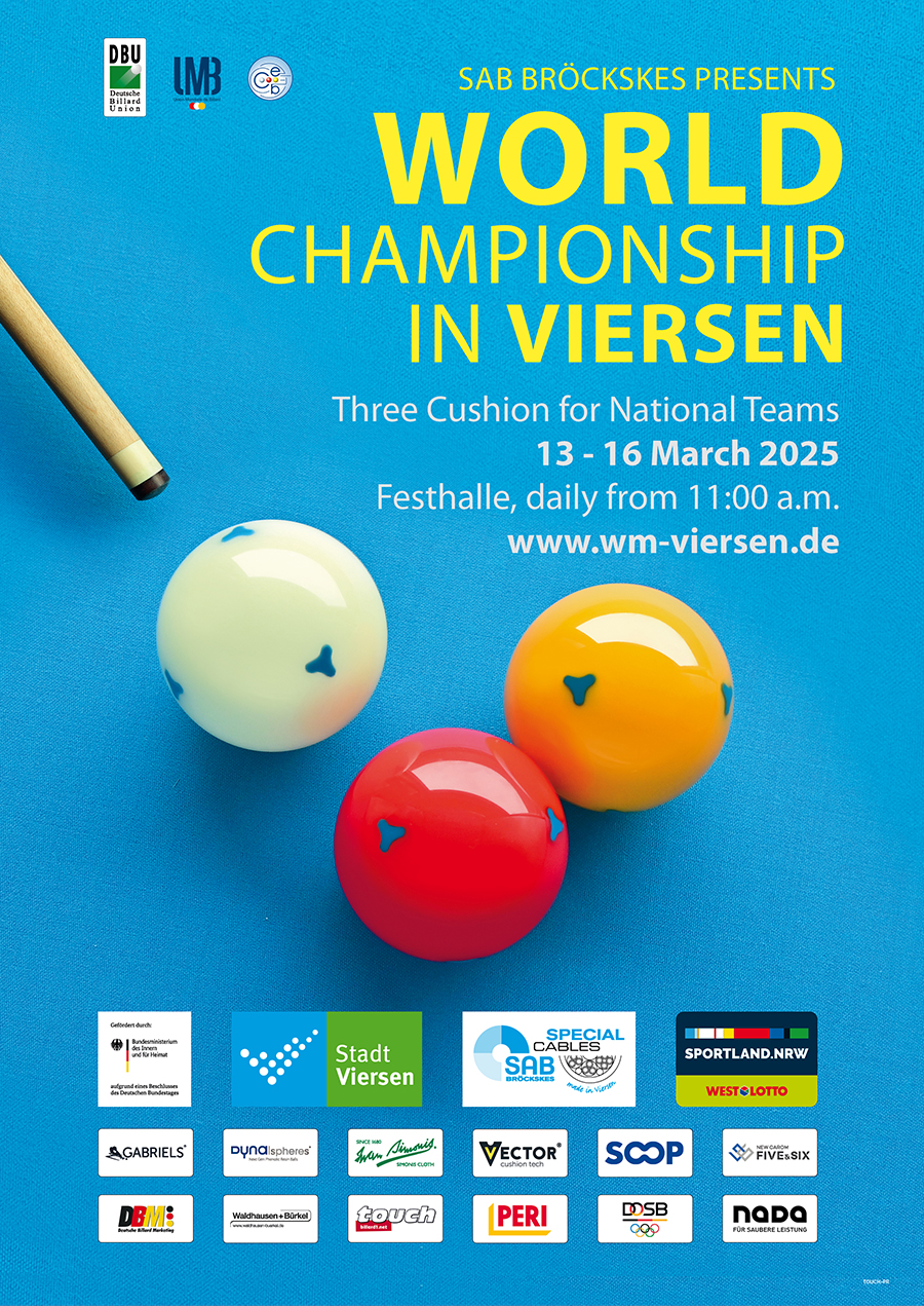 The picturesque city of Viersen, near the border with the Netherlands in middle Germany, is the traditional host for the UMB World Championship 3-cushion for National Teams. The event has been played since 1981, in Viersen’s Festhalle since 1990. From 13 – 16 March, the title is again at stake, with Vietnam (Quyet Chien Tran / Phuong Vinh Bao) as the defending champion. The same two players will defend Vietnam’s colors in 2025.