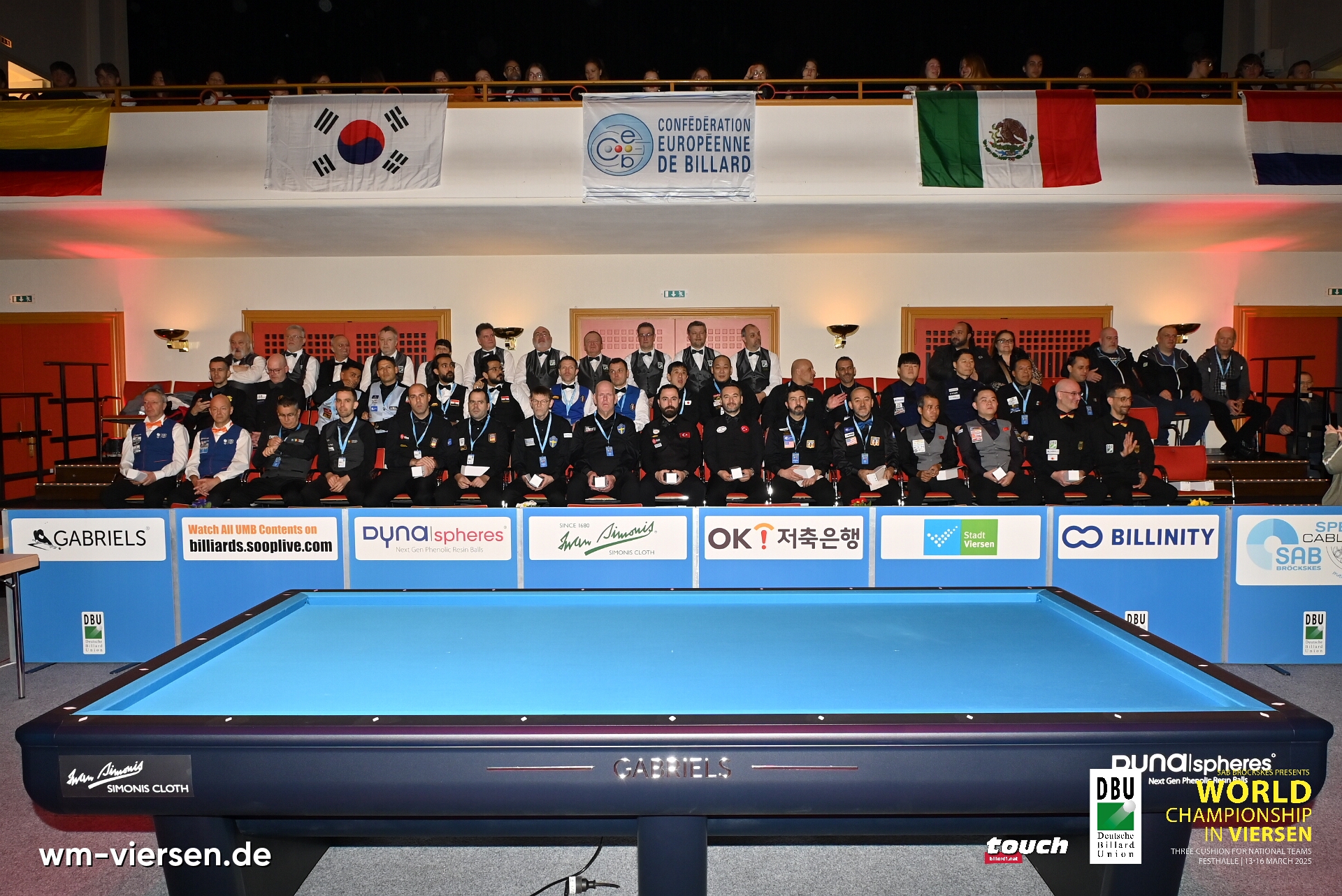 The tables in Viersen are Gabriels, the cloth is Simonis 330 Prestige and the balls are Dynaspheres. Standard UMB rules apply.