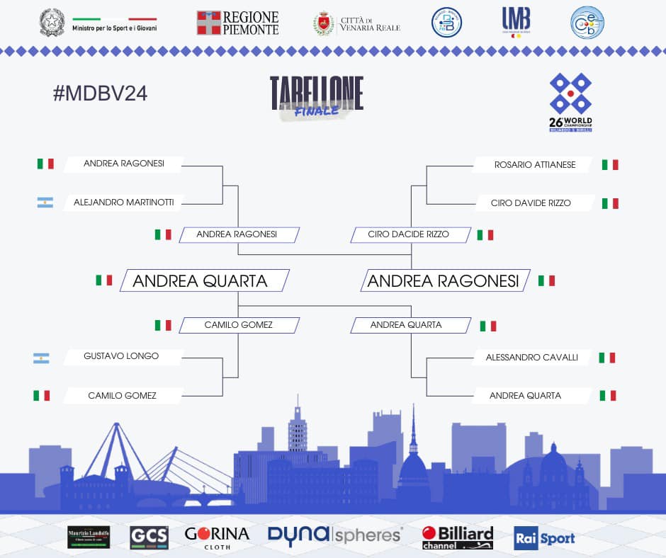 The knockout phase will begin today, Saturday 5 October, starting at 10:00 in the Sala della Citroniera of the Reggia di Venaria. The matches will be broadcast in livestreaming on the Federale Billiard Channel. Starting at 18:00, one of the quarterfinals will be broadcast live on RaiPlay.