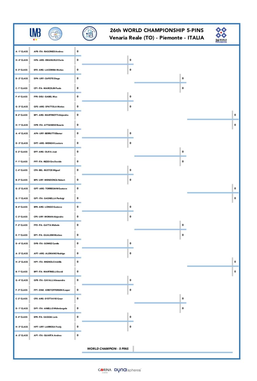 The draw of the 32 athletes who have officially earned a place in the knockout rounds of the 26th 5-pins World Championship, held in the magnificent setting of the Reggia di Venaria, has been set.