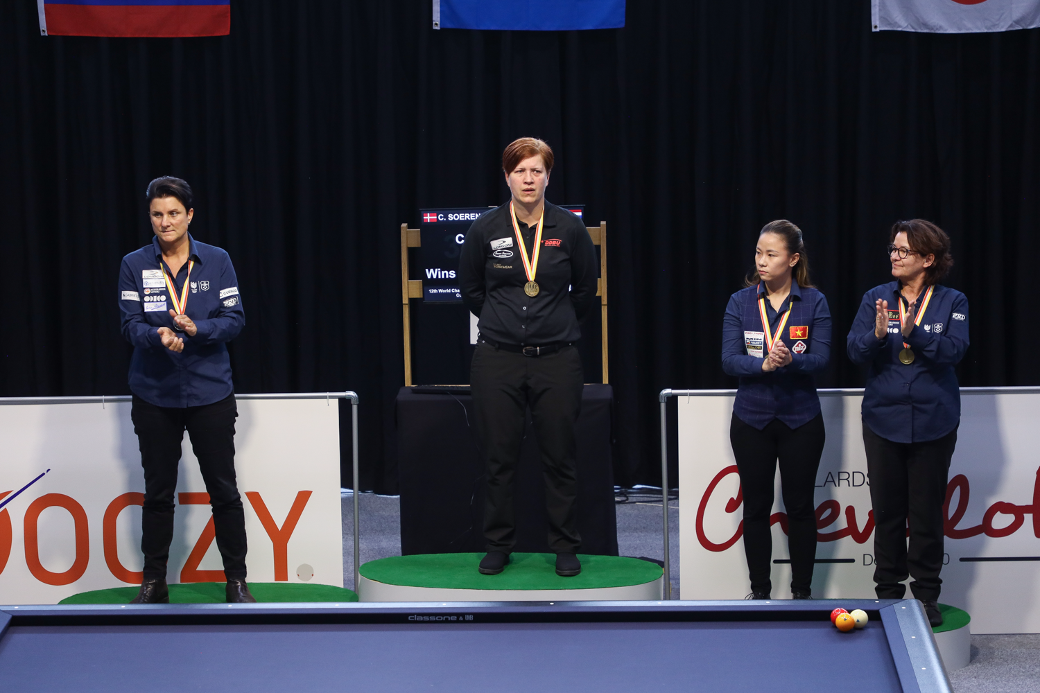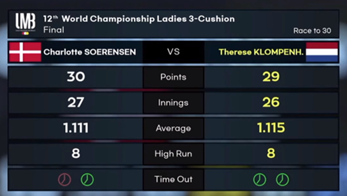 At the end of an exciting second day in the World Championship 3-cushion for women, the four semifinalists are known. Charlotte Sörensen from Denmark, Nhi Hoangyen Nguyen from Vietnam, Therese Klompenhouwer and Karina Jetten from the Netherlands.