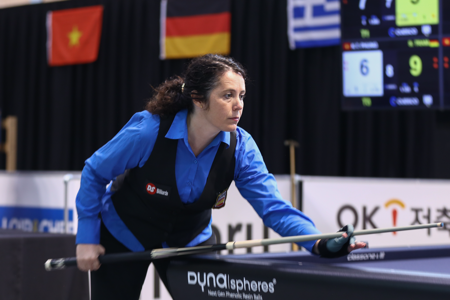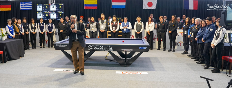 The tables in Blois (France) are Chevillotte, the cloth is ClassOne B2 Black and the balls are Dynaspheres. The women will play to 25 points in the group, 30 points in the K.O. For the juniors under22 the distances are 25 and 35 points.