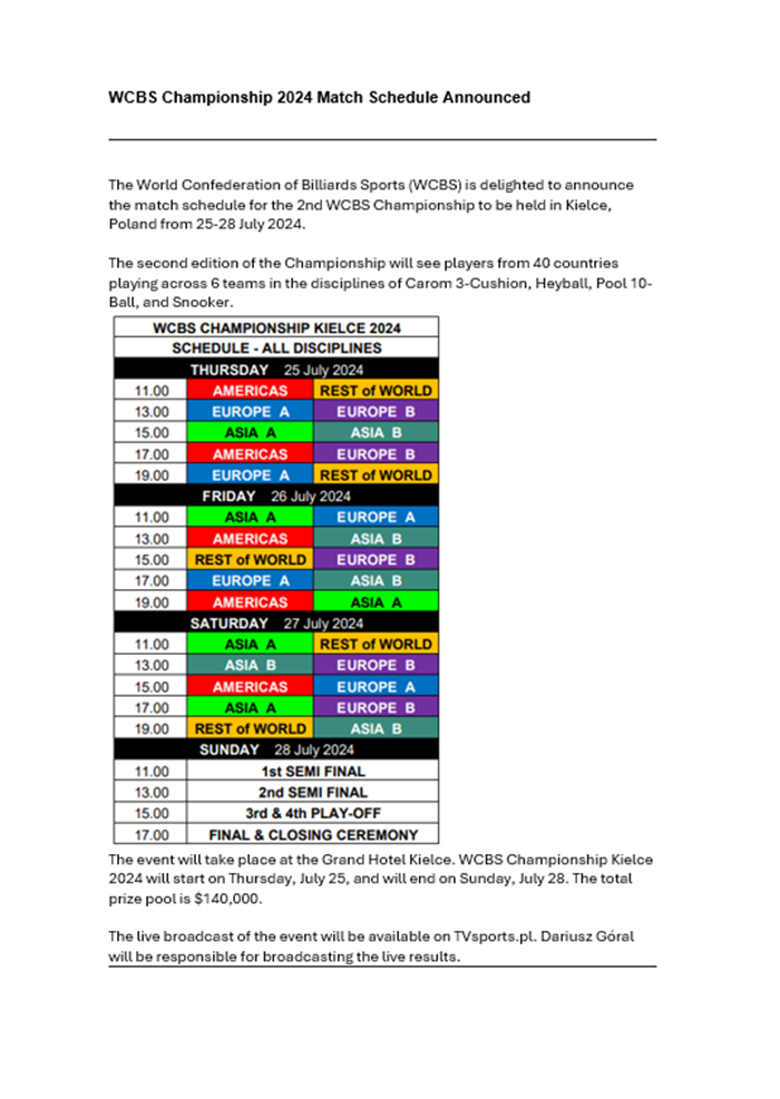 For all important information about the schedule, the player list and the livestream, please visit the following link: https://wcbs.sport/wcbs-championship-2024.