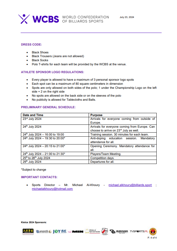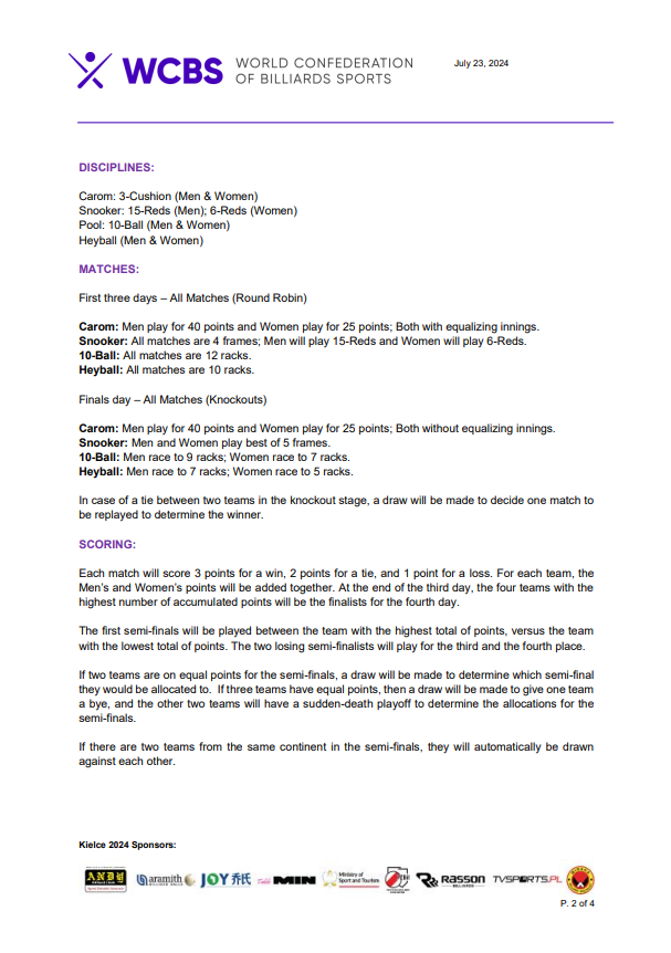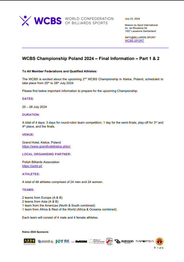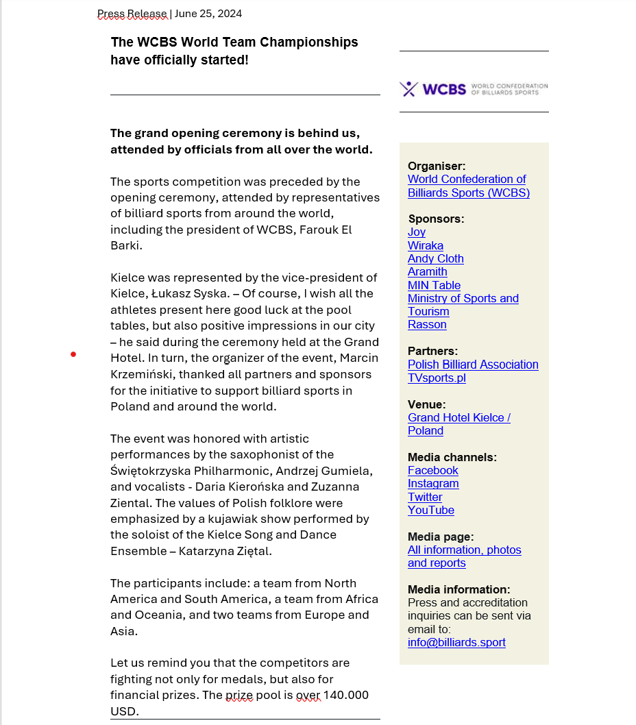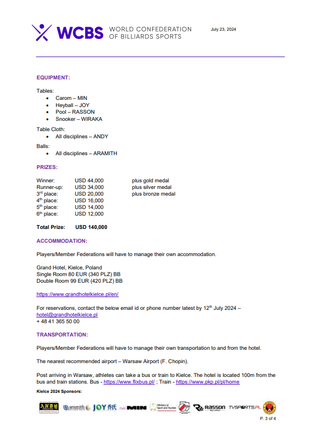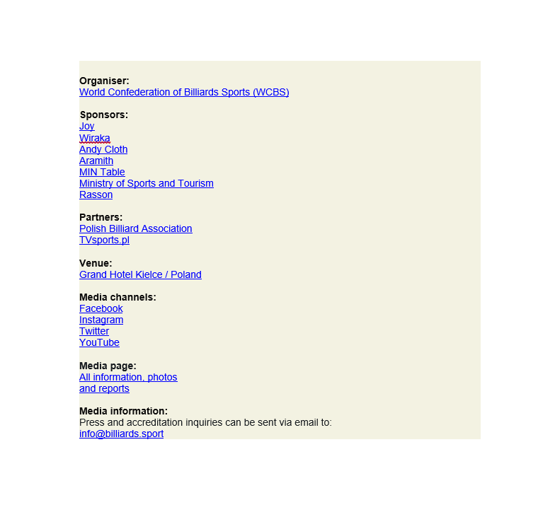 WCBS would like to thank its sponsors: Andy Cloth, Aramith, Joy, MIN Table, Ministry of Sports and Tourism of Poland, Rasson, and Wiraka for their great support, without which this event would not be possible.