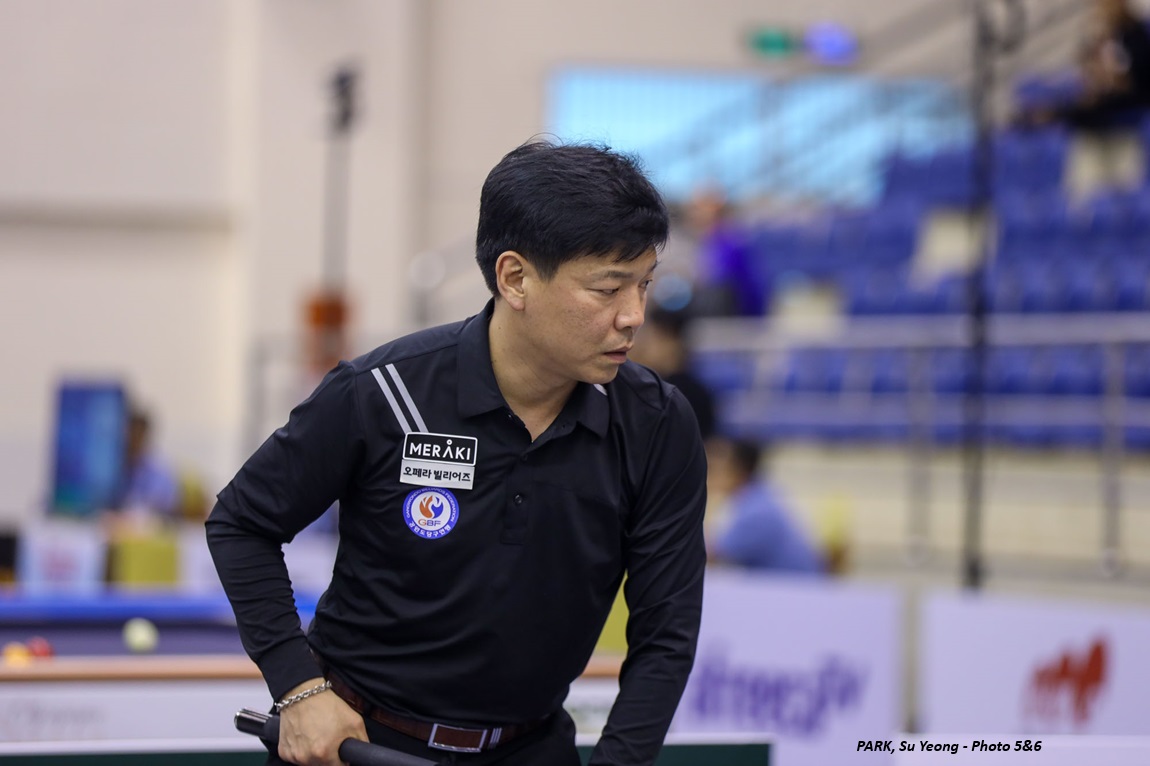 Su Yeong Park from Korea was the number one on Tuesday: he won twice and used only 32 innings for 60 points. The relatively unknown but very experienced O Takeshima from Japan was close behind: 60 points in 33. Japan has another player in the race: 2007 world champion Riiuchi Umeda, who won his group. Japanese veteran Tatsuo Arai was eliminated.