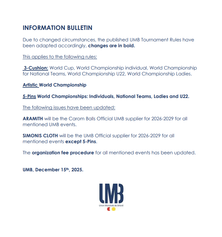 UMB TOURNAMENT RULES HAVE BEEN ADAPTED Published on: December 13, 2025 Share: Twitter Facebook Copy Link