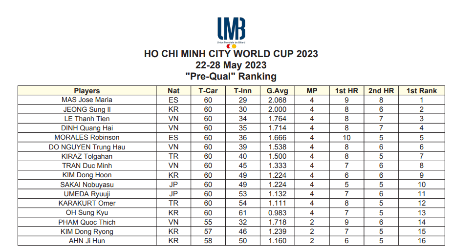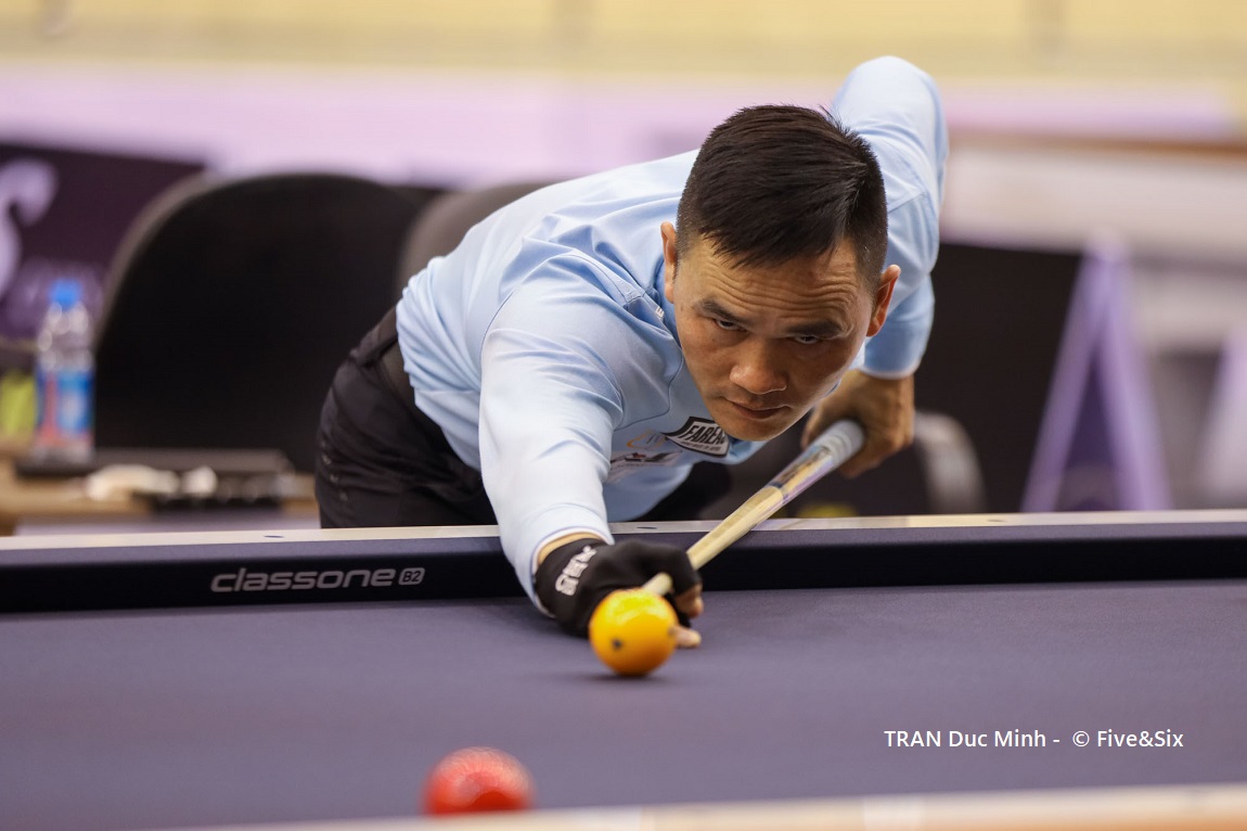 On the second day of the Ho Chi Minh World Cup, the home players again made a strong impression. Of all the qualifiers for day 3, even the lowest averaged over 1.000. D.M. Tran was the (shared) best player of the day, thanks to a sensational win in 9 innings (30 pts). He struggled in his second match, but still recorded 1.714 and a ticket into the PQ.