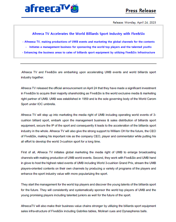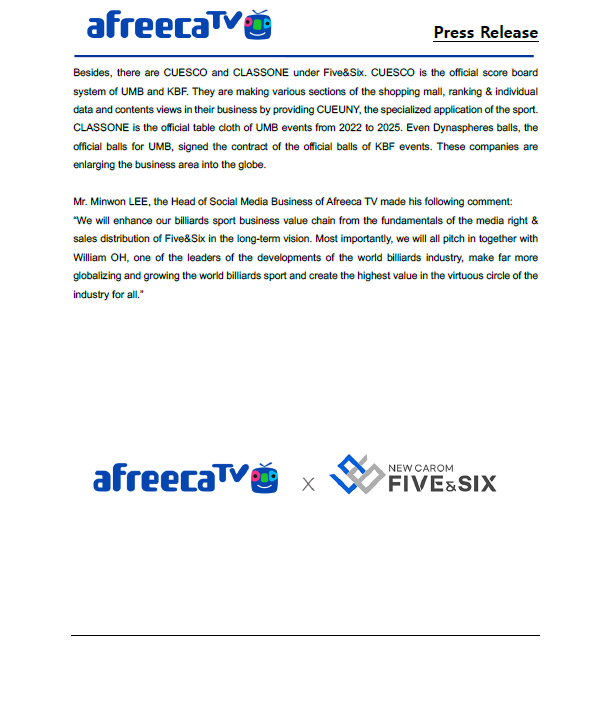 Five&Six Co. Ltd., the current media partner to the UMB, have respected their payments and have continuously shown reliability and support for the organizations, the game, and its players. A commendable position to take that has allowed for a fruitful partnership that will continue to see mutual support for innovation and growth of 3-Cushion Billiards, especially with the new partnership between AfreecaTV and Five&Six (AfreecaTV press release attached below).
