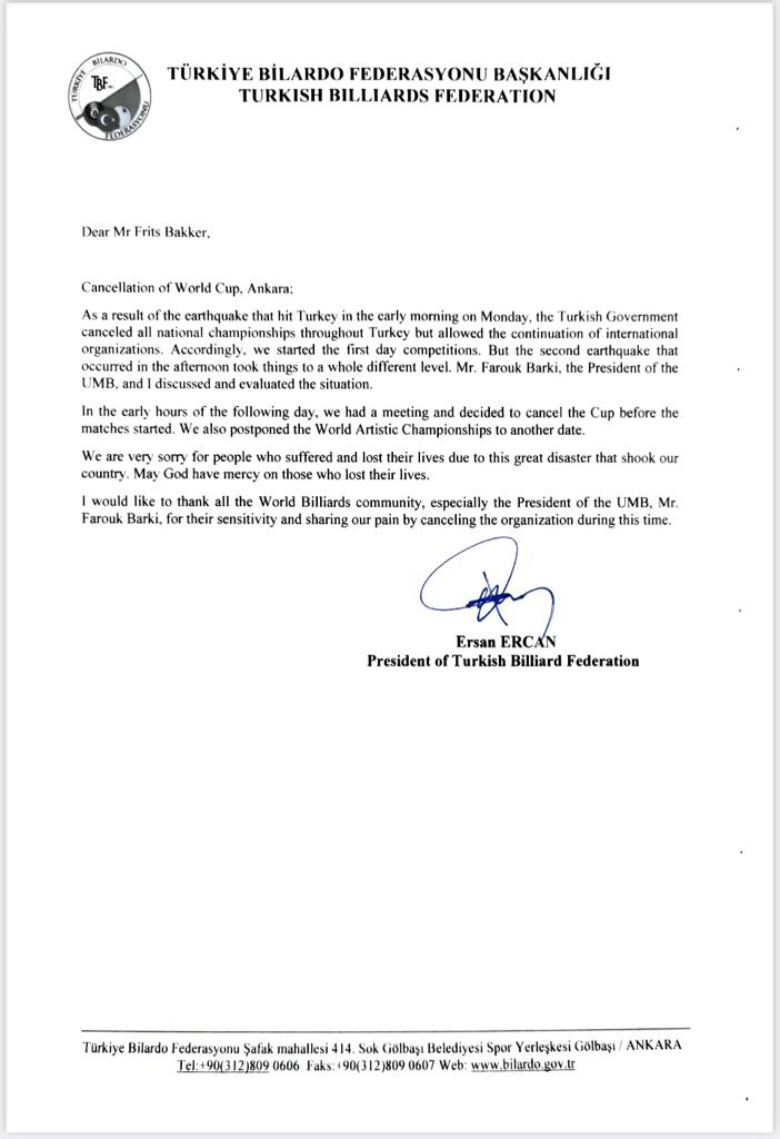 An international Media Company has published an article that obviously shows a lack of understanding of the actual situation as it happened. To clarify, Mr. Ersan Ercan, the TBF President, has outlined the situation on Wednesday, February 8th, 20023, in the self-explanatory letter below.